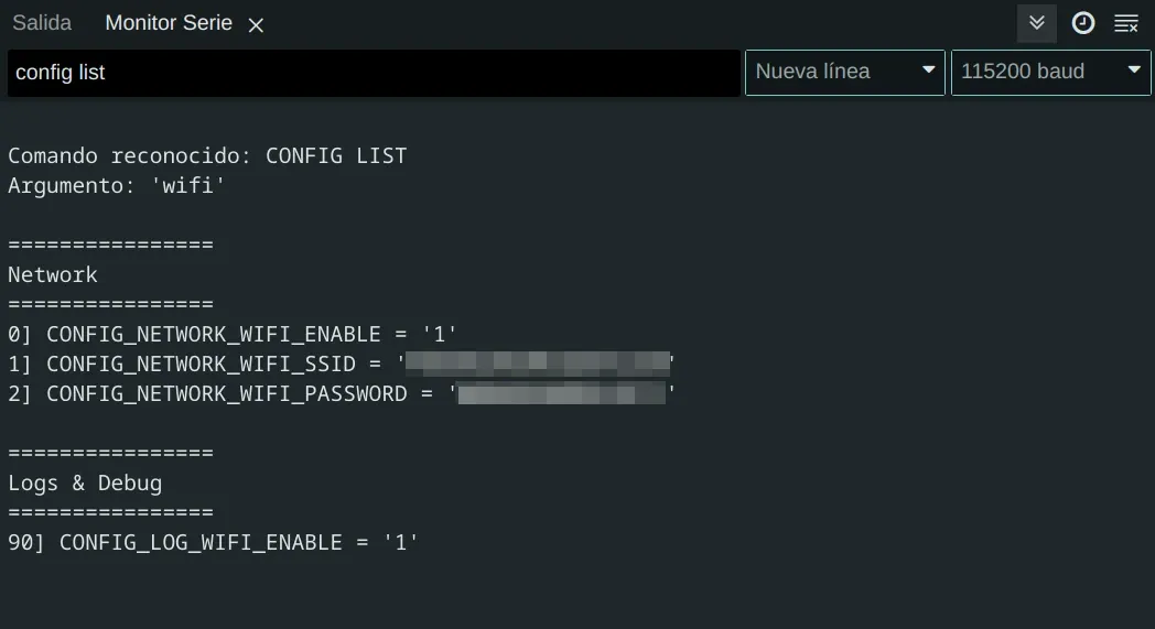 Cuando introducimos en el terminal serie de arduino ide, el comando "config list wifi" nos da estos resultados:
